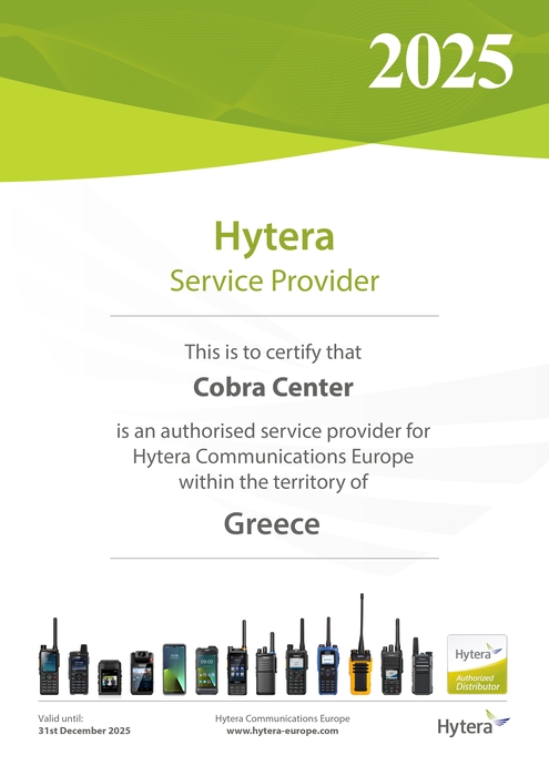Hytera Communications Co. Ltd., established in 1993, is the largest supplier of professional radiocommunication equipment and integrated solutions in China and one of the largest in the world. The cooperation with Cobra Center started in 1998 and was further established in 2013. Being dedicated to the development, manufacture and promotion of products, it offers PMR analogue products, DMR digital, TETRA, Norsat for satellite communications, conventional, coupling systems, portable and vehicle / desktop. Hytera offers complete communication solutions to the Army, Police, Public organizations, private security companies, public utilities, transport companies, hotel companies, etc. achieving the highest efficiency in the organizational operation and in the distribution of tasks through its special applications. Hytera’s goal is to offer high quality products and services. The ownership of the subsidiaries Sepura, Norsat, Sinclair & Teltronic, which are world leaders in their fields, has played a significant role in achieving this goal.