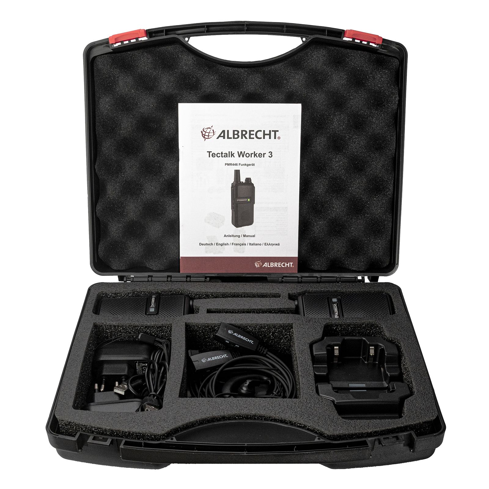 The Albrecht TECTALK WORKER 3 is a transceiver with 16 PMR channels and it has a battery save function. The transceiver has a durable cabin and it is resistant to rain, so it is perfect for outdoor operation. It also has a range of up to 10 Km, a battery autonomy up to 14 hours and a suitcase for transport.