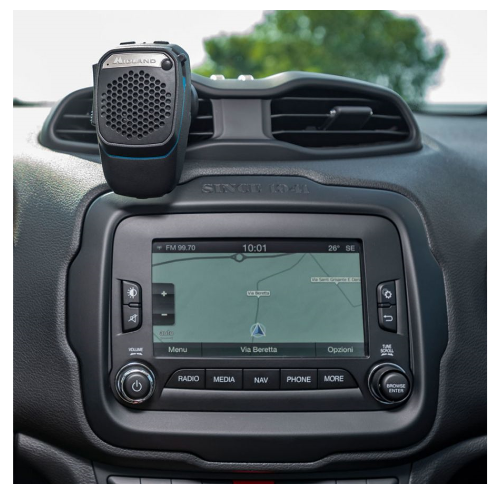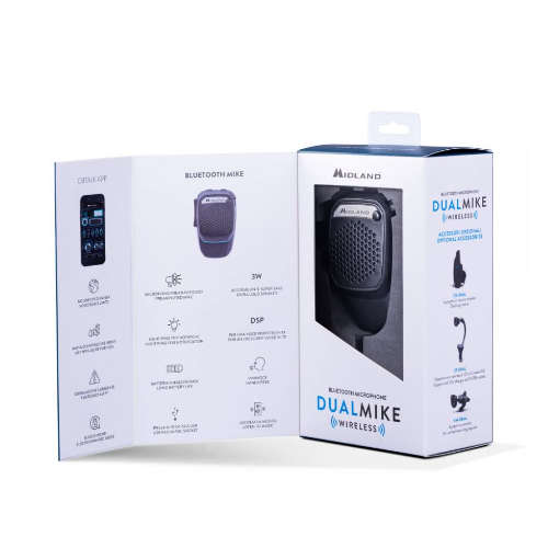 Midland Dual Mike Wireless has the ability to connect via Bluetooth to the mobile phone, where it can be used for phone calls, listening to music and through the free CB Talk application to talk freely with friends and colleagues. The microphone also has powerful 3 watt speakers and DSP signal quality processing for perfect voice.