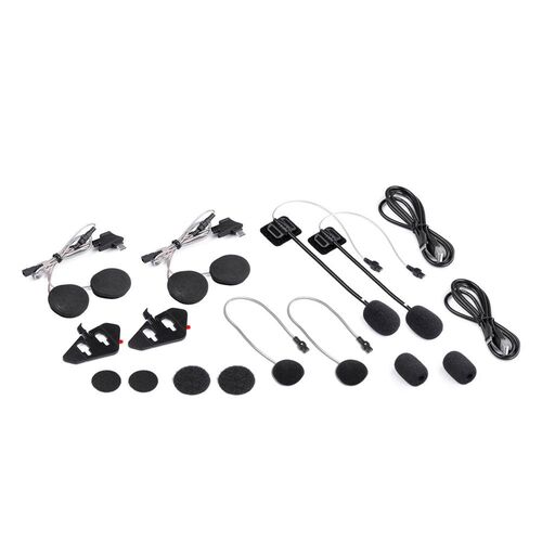 Package contents: Two BT MINI RCF units, two complete audio kits with two RCF 40 mm speakers, two wired microphones for full-face helmets, two boom microphones for open-face helmets, two USB Type-C charging cables, two replacement foam covers for boom microphones, Velcro pads for mounting the speakers and microphones, two adhesive bases with double-sided tape, and two mounting clamps.